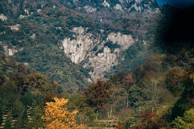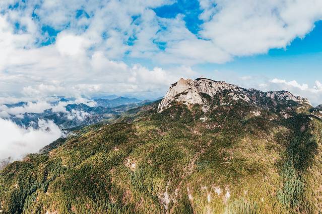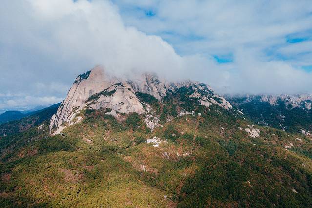 远观之下,巨大的花岗岩体裸露在外,可以清晰的看到岩石的纹理。而茂密的植被都长在山腰之上。