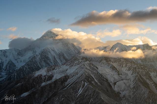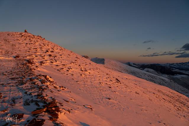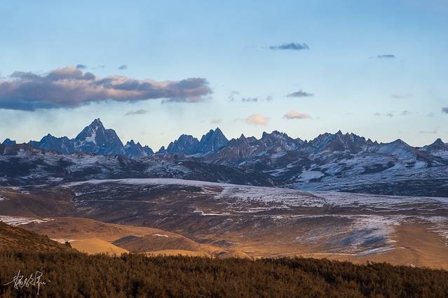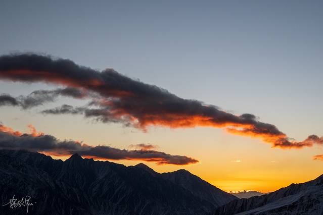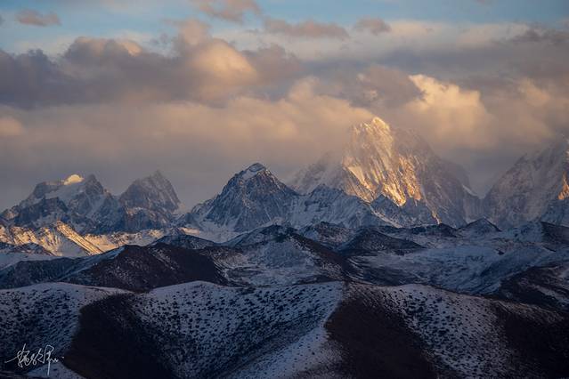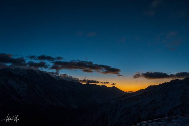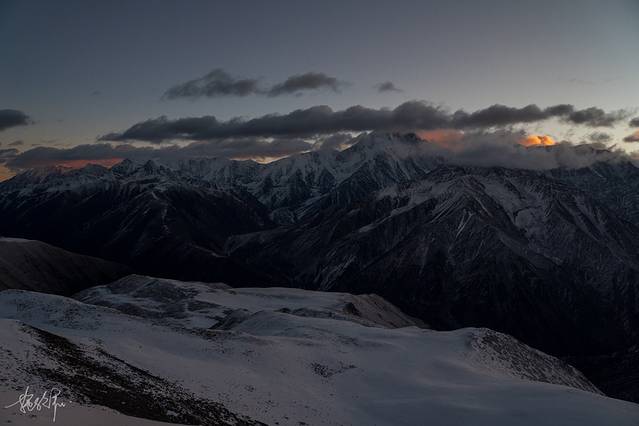 天已经开始有了一丝丝的蓝紫黄的光线,在贡嘎山主峰的右侧,是今日太阳蹦出的方向。日照金山肯定是没有了的,但也不妨碍我满心欢喜地期待一会儿的日出。