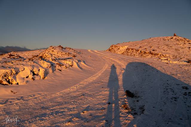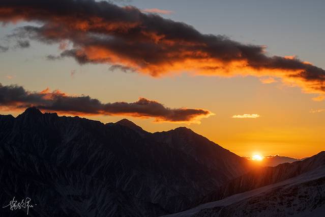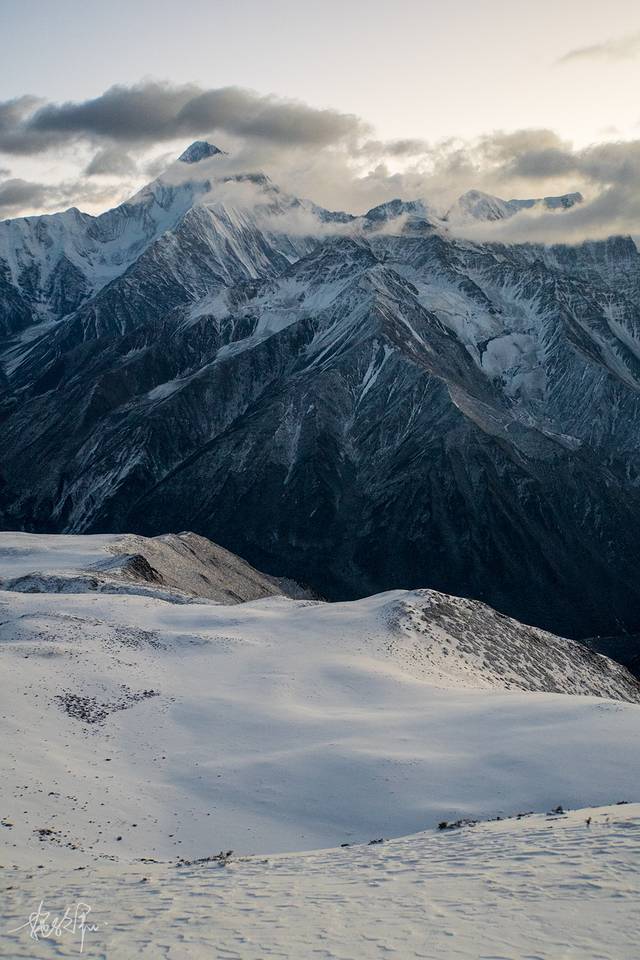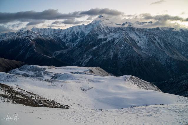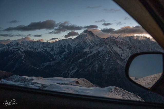 透过车窗,天朦朦亮,远处的贡嘎神山主峰也显现了出来,我们在天寒地冻的车里等待着日出。要知道我的鞋子昨天下午还整个浸在了雪地里,即便是标榜着户外靴不会进水,也抵挡不了雪从袜子端穿越进去,所以此刻我的脚甚至冻得失去了知觉,太冷了。