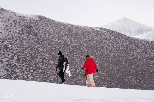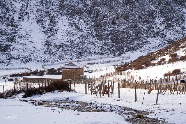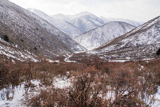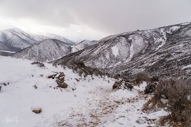 缓步向山里走去,整个路程我们走了大概两个半小时多一点,走到半山腰时天下起了大雪,让原本就不太好走的山路雪上加霜。有那么一些瞬间,我甚至都以为我要雪盲了,走在路上白茫茫一片又没有墨镜,眼睛只能直勾勾看着远处的灌木丛林,好歹有点黑色,能减少点雪盲的机率。