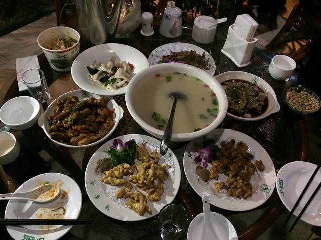 慕名而来就是奔着他家的鲟鱼七吃(头尾汤、生吃鱼片、椒盐鱼皮、白灼鱼肝、溜鱼片、红烧鱼杂骨、炸脊骨)。
