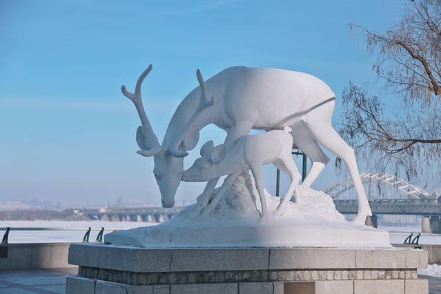穿城而过的松花江冬日时节已完全被冰雪覆盖,成为独一无二的风景线。