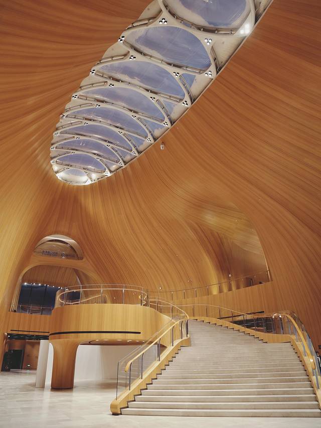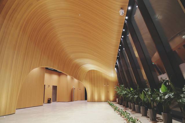 这里是亚布力企业家论坛永久会址,外观仿若破茧成蝶,内部温暖原木色调,线条简约流畅,在这方白色世界里非常有意境。