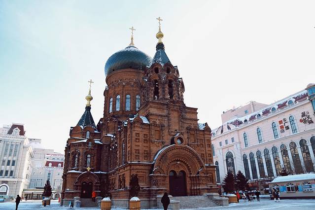 圣索菲亚大教堂就在中央大街附近,这座教堂受拜占庭风格影响,又有俄式洋葱顶,华丽典雅。