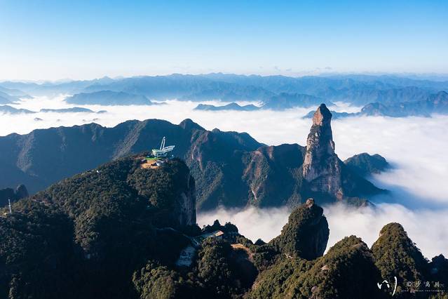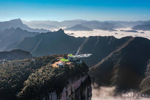 南天顶是景区的制高点,也是离观音峰最近的观景台,在海拔869米的高空中,一座塔高30米,悬高400米,悬挑面积1000余平方米的玻璃观景台嵌于峭壁之上。