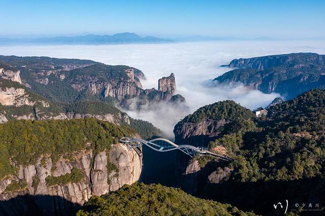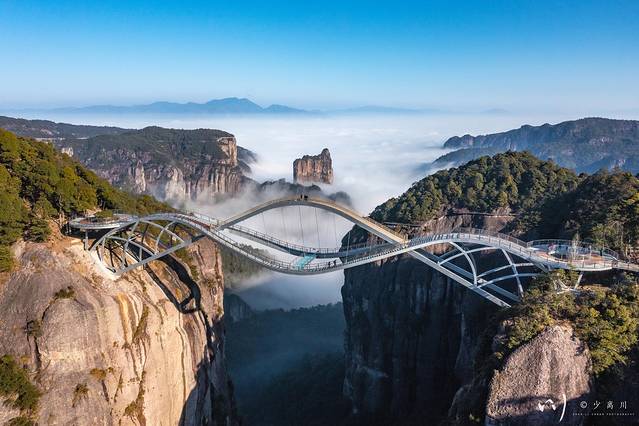 下索道爬一个小坡就到了第一站——如意桥,刚柔并济的造型与神仙居的自然风光完美地融为一体,宛如一柄空中的玉如意,又似仙女的披帛,是欣赏“一帆风顺”绝佳位置。