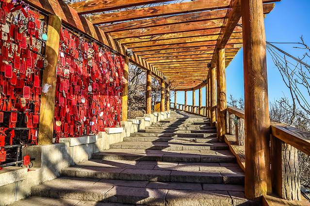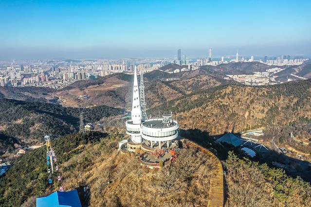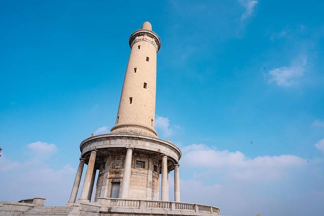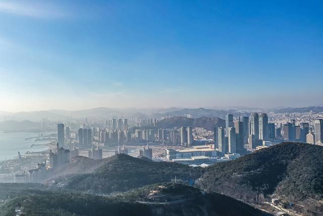 莲花山:大连市内最高峰,风把墙上的祈愿福牌吹的咚咚作响,像木质的风铃声。观景台像一只锥螺,白色和蓝天交融,屹立在山海之间。