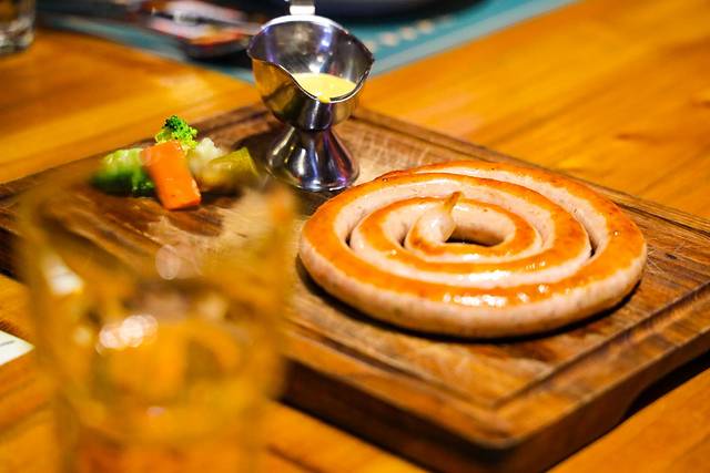碳烤盘肠:是一道非常扎实的肉肠,招牌菜之一,肠衣很薄,肉质q弹,火候正好,沾上俄式辣酱,嫩香不腻,特别适合肉食爱好者。