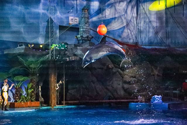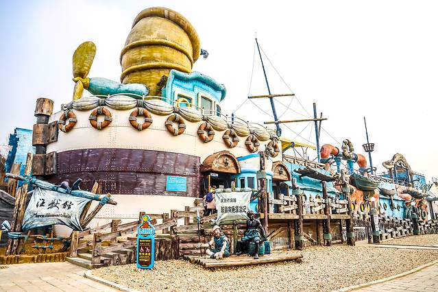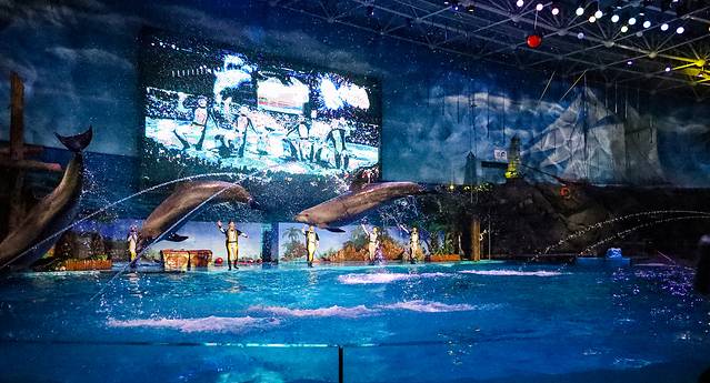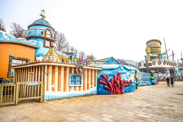 海兽馆:海兽馆主体造型为卡通味十足的海盗船栖于海岛边的场景,色彩鲜艳,造型怪异,不论从建筑形态上还是动物展示上,都堪称绝世之作。海兽馆分地下一层,地上二层,总屯水量近3000立方米,整个池内的24小时循环水均是由专业的水处理系统净化处理的,透明度极高。人们可以从水下、水上和高空不同角度来观赏海洋动物的生息百态。