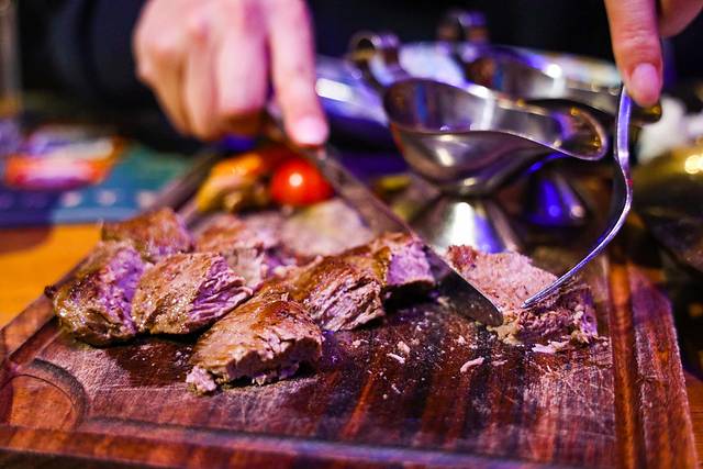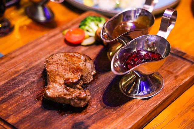 俄式沙朗牛排:七分熟,肉嫩而有嚼劲,一份有2块,会配2种酱汁,红酒汁和黑椒汁,每个人可以根据自己的喜好选择。