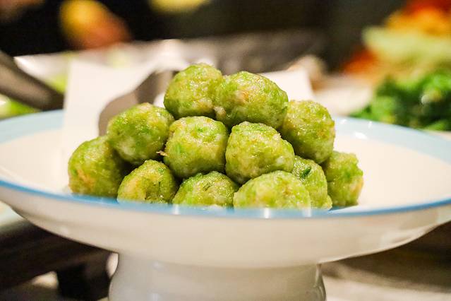 鲜虾芹菜丸:是西芹和虾肉做成的丸子,视觉上淡绿色很好看,看不出是虾肉和芹菜做的,但每个丸子全是慢慢的虾肉,好吃不腻。