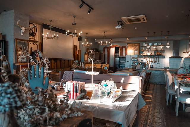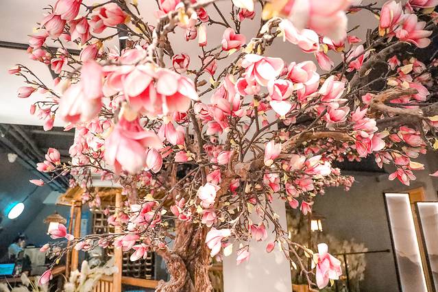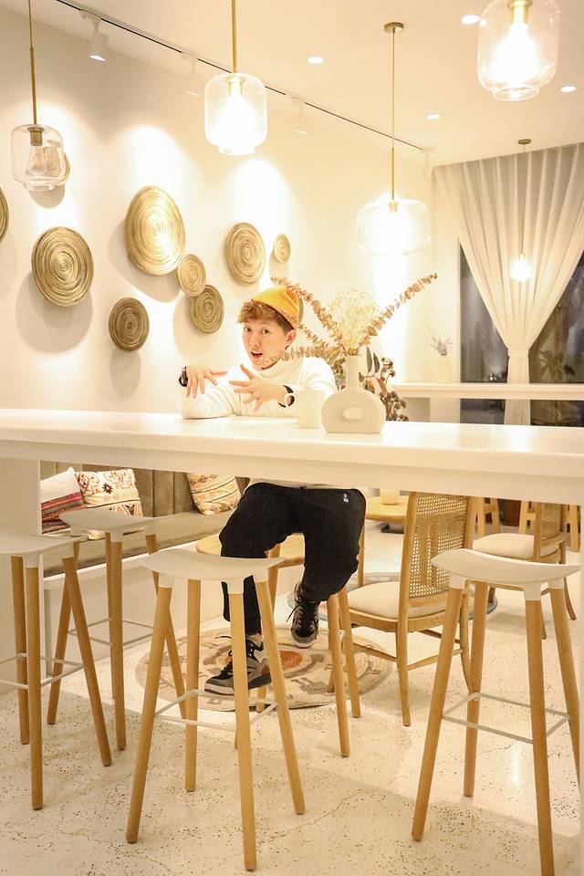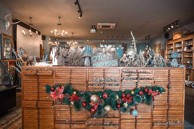 一楼是分为2部分,初入民宿,看到的就是大堂和吧台,此后是用干花花台做了隔断,后面就是开放性厨房,拥有好几张超大的餐桌。