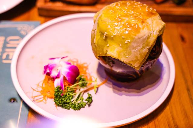 俄式焖罐牛肉:经典的俄式西餐,外观十分有特色,很好看,罐子上有一层酥酥的千层饼作为盖子,里面是番茄汁炖的牛肉块,酸酸甜甜的,直接用刀切开,用勺子挖即可。