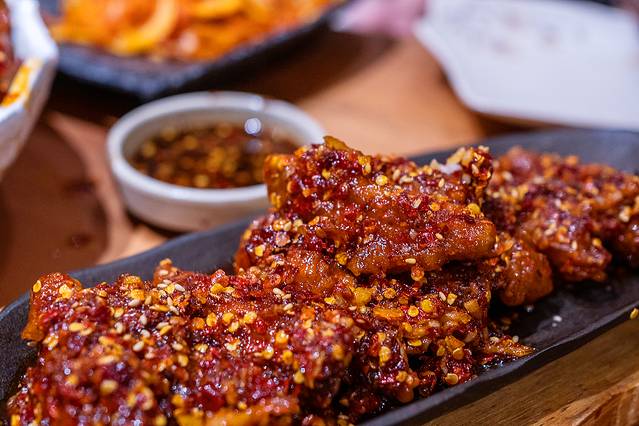 香辣鸡翅:堪称是桌桌必点的人气菜,脆脆的,辣辣的,是我吃过最好吃的鸡翅,没有之一,上面裹着甜辣酱,有点蒜香味,里面的鸡肉超级嫩,很下饭。不过提醒下,建议这个最后吃,由于很辣,吃完再吃其他的,可能就吃不出其他的味道了,辣的很过瘾,让人欲罢不能。