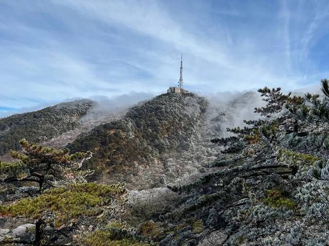 我去的时候前几天刚下过雪,一路上到处都能看到晶莹剔透的雾凇。上山路上时不时出太阳,爬在我前面的陌生小姐姐还喊我回头看阳光下亮晶晶的雾凇,结果顺势化来一阵雨淋在了我的身上。