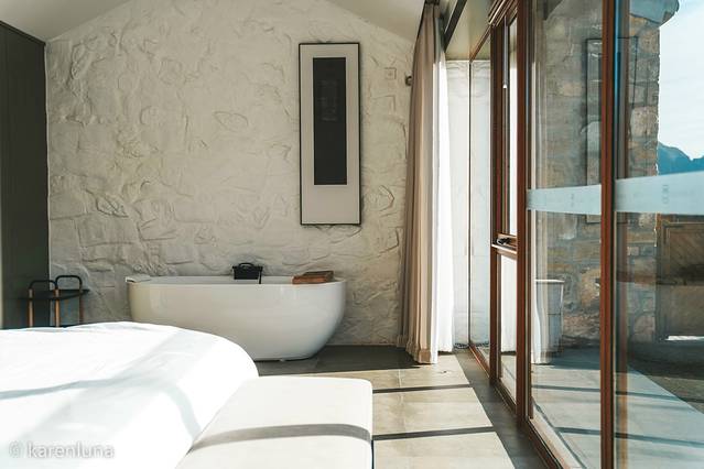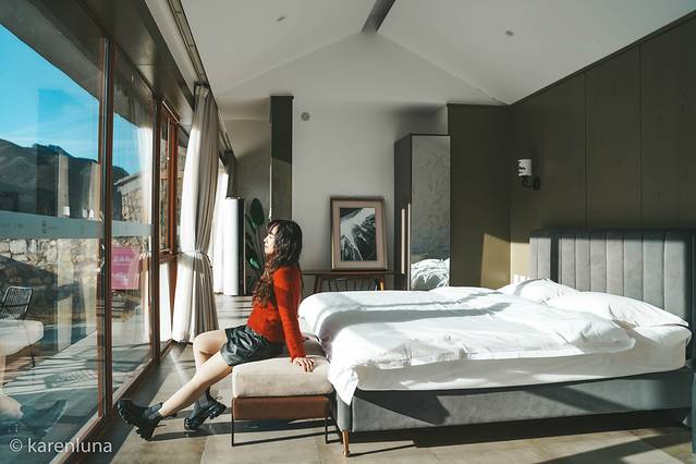 而当推开客房的那一刻,屋内被阳光照射的温暖感扑面而来,室外的寒冷随即消散,有种瞬间被治愈的感觉。房间的温馨现代时尚感和落地飘窗外隔山而望的开阔感,简直让人太舒心了。很难想象这里曾经是一片老旧破败的村里土房。本以为现在流行的时尚元素会与原本的中式风格违和,却没想到融合得刚刚好,诠释了传统与现代、中式与西式的完美碰撞。