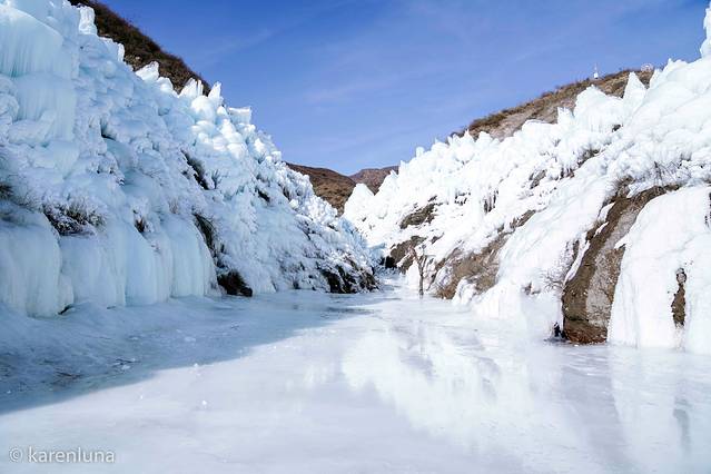 云瀑沟是位于北京延庆和河北赤城交界处的一条山涧,夏天这里有很多条自然形成的溪水瀑布,所以得名云瀑沟。而到了冬天,整个云瀑沟就变成两个冰雪的世界。除了震撼的冰瀑奇景,探秘冰溪、穿越山野,云瀑沟赋予了北京冬季全新的定义。虽然知道这是个完完全全的人工造景,但也丝毫不影响人们对美景的欣赏,当走进冰雪世界看到眼前的一整片蓝冰时,不由得拿出手机不停的拍照。