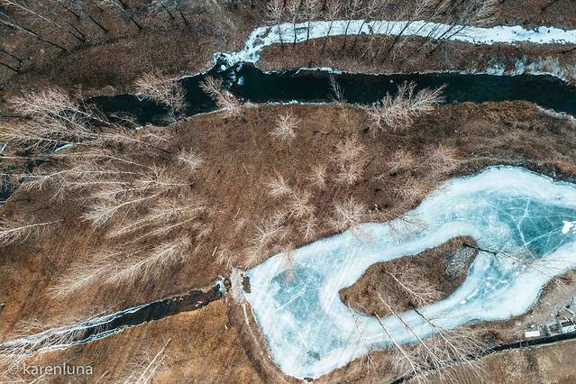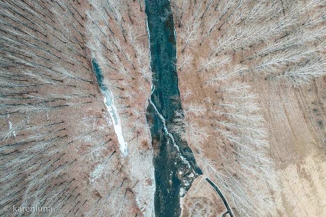曾经的夏日里郁郁葱葱小桥流水,如今却是一整片密密麻麻的枯树林区。走在无人踩过的雪地上,耳边只有咯吱咯吱脚踩枯叶的声音和不远处小溪流过的声音,这种幽静无人的空旷感让人有种回归自然的放松感。