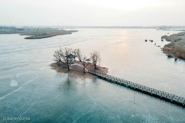 野鸭湖占地面积非常大,这里不仅是生态旅游的热门观鸟地,还是北京重要的湿地自然保护区。夏天这里成片成片的芦苇遍布整个景区,秋天时分这里则变成了一片金色的海洋,而到了冬天,芦苇便被一捆捆的割掉,一片凛冽清透的荒凉感,用“林寒涧肃”这个词形容真是再恰当不过了。