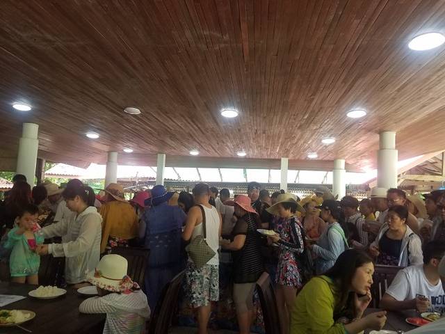 之所以会菜上的那么慢、一多半食物盘都是空地、碗和盘子还有夹子那么少,不是店家不舍得买,而是如果都准备地熨熨帖帖,夹走的食物就多了,吃掉的也多了。为什么空调那么少?因为凉快了你就会待的久一些,这样吃掉的食物更多,且下一个团来了就坐不下了。毕竟这种专门给中国旅行团供餐的饭店每天中午就开张一个多小时,所有的中国团都会凑这个时间来,因之还要影响行程、压缩景点时间、紧赶慢赶。换言之,各方面都奇差是店家刻意为之,就是为了逼游客们尽快走人,以减少拿取量和更快腾出地方。笔者走出饭店的时候,看到又有四个团黑压压地杀来了,其中很多人满脸憧憬,看样子是和我之前一般,非常兴奋地准备好好享受这顿“国际海鲜自助大餐”呢。