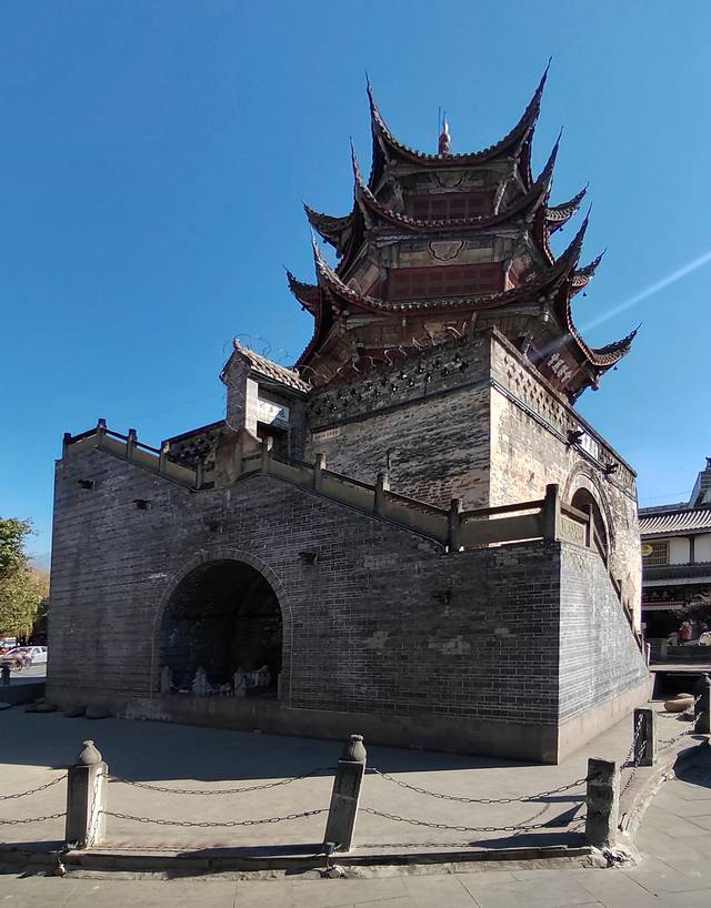 钟鼓楼始建于清朝道光十八年,光绪十三年和民国元年两次重建。三层每一层均檐角反翘,悬挂有风铎,整个建筑十分壮观。