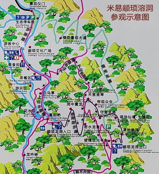 我把旅游地图稍加工了一下,停下车顺步游道经颛顼文化广场和游客中心,沿上山步游道到高阳桥,便进入颛顼龙洞入口。进洞顺溶洞步游道逐渐上行,观赏溶洞喀斯特地貌和各种溶洞景点,最后上到龙洞出口,然后就是沿下山步游道下山。整个像爬了一次山一样。