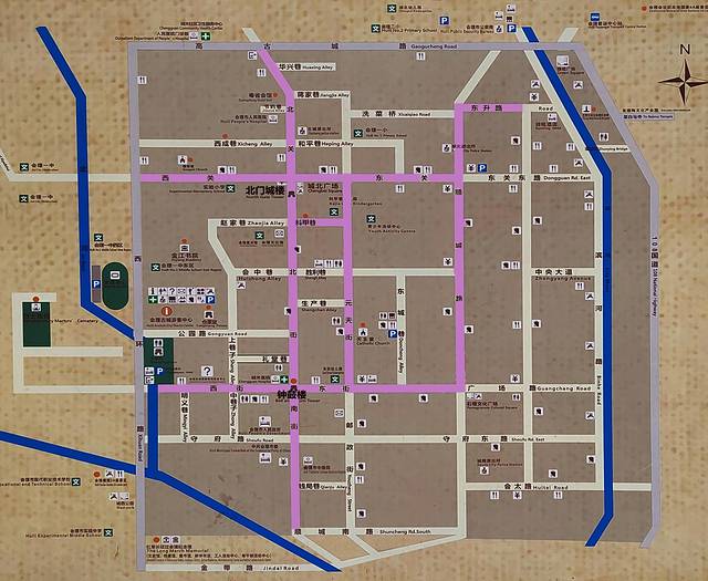 从街道看,有南街、北街、东街、西街、东关、西关、北关7条主街。主要景点由北门城楼、钟鼓楼等向四周展开。