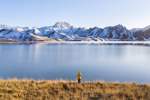 旅途中总是会有很多意外之喜,比如都兰热水乡古墓群旁边的雪山群,见到的那一刻,我们都一致决定当晚在这里露营,晚上拍摄银河和第二天早晨的日照金山。这里靠近科肖图自然风景区,所以风景很不错,面前的是洼沿水库,雪山就倒影在上面,可能冬天的雪山群会比较明显一些。清晨的雪山犹如童话世界里面的场景一般。