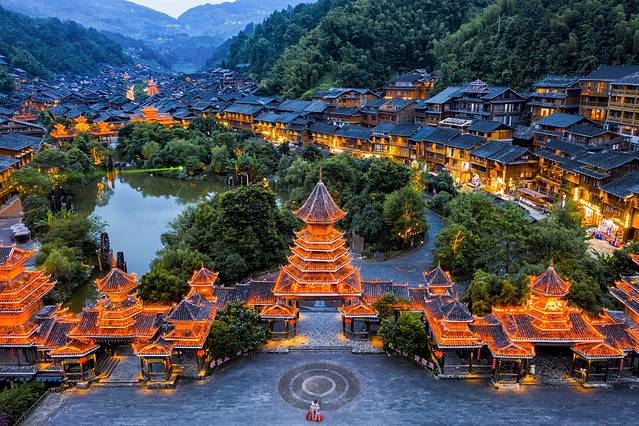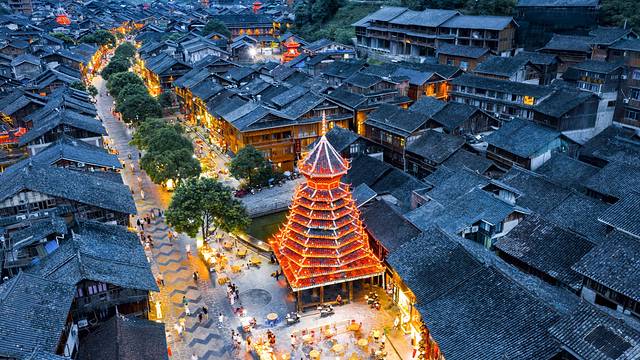 肇兴侗寨的一大特色就是夜景,当仁团、义团、礼团、智团、信团五团的鼓楼灯光亮起,就不似人间烟火一般。