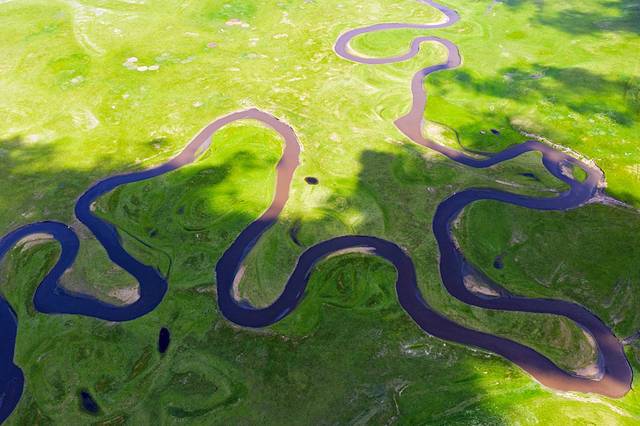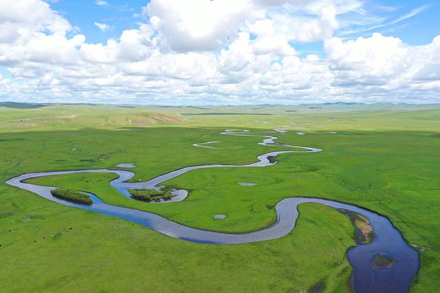 草原上的莫日格勒河,终于看到了草原全绿的样子。蓝色的河流在一望无际的草原上蜿蜒曲折,不亏为“天下第一曲水”。
