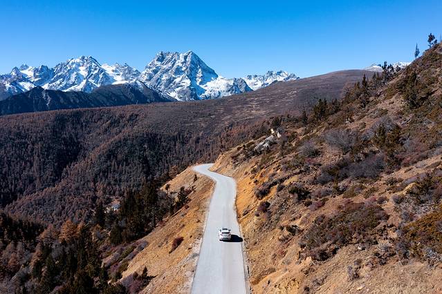 前往布加雪山炳茸冰川的路上,很喜欢这里的公路,四周跟小瑞士一样的感觉。雪山环绕的峡谷下是蓝色的河流和秋天的美景,随处可见的牦和藏族村落。