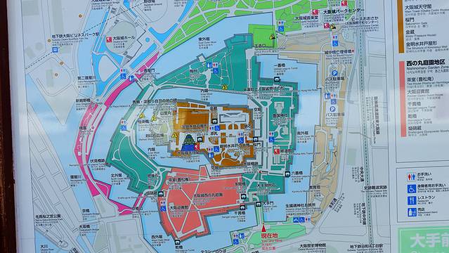 在大阪城门口有地图介绍,走过一条长长的甬道,从大脚门进入大阪城,正面高耸的墙壁上有个脚型的巨石,不知道是不是大脚门名称的来源,左拐经过巨大的铁门才进入到大阪城,这种设计有些类似中国的瓮城。进入大阪城后,左手边就是著名的西之丸庭院,是著名的赏樱花的日式庭院,可惜当天闭园休息。