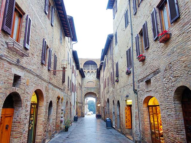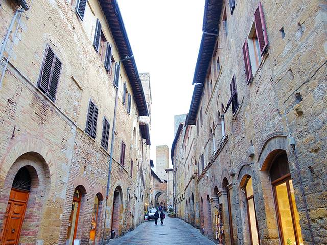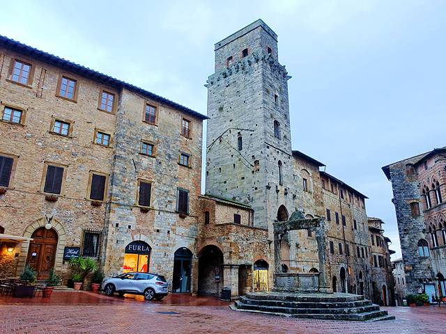古城旁边有几个停车场,停好车从大门进入圣吉米尼亚诺,两边都是高耸的石头房屋,里面却是精致的住家和店铺。一条狭窄的石头街道,贯穿了整个古城。古城的最高点就是水井广场,那里有中世纪的八角水井,有前主教堂和钟楼。这座城市穿越岁月长河,把我们从现代回到了中世纪。