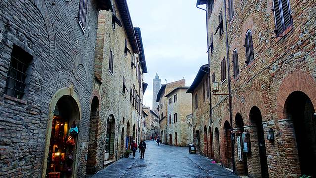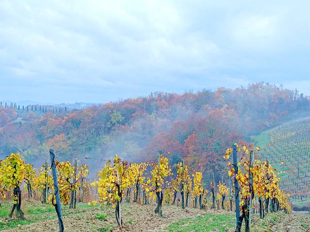 从佛罗伦萨出发已经是下午,天气有些阴雨,但是依然难掩托斯卡纳秀美的乡村景色,路边都是大片的葡萄园,起伏的山丘上是红色的树林,突然云雾散开一角,就看到了山顶上的古城和塔楼,如同虚无缥缈之幻境。