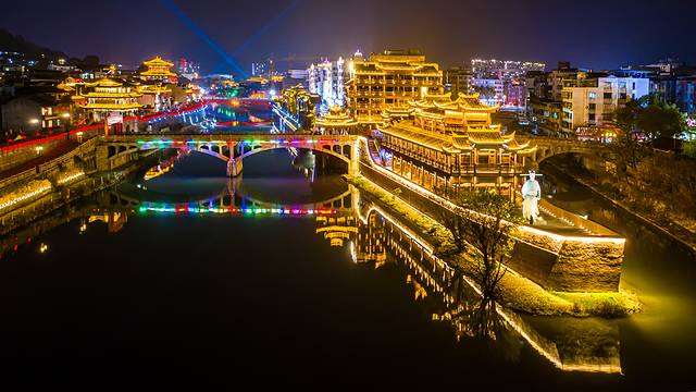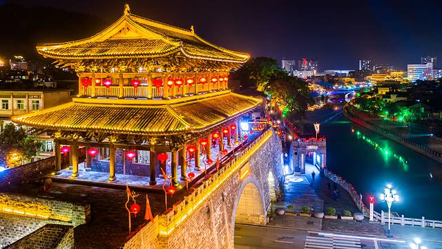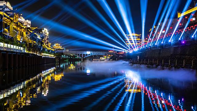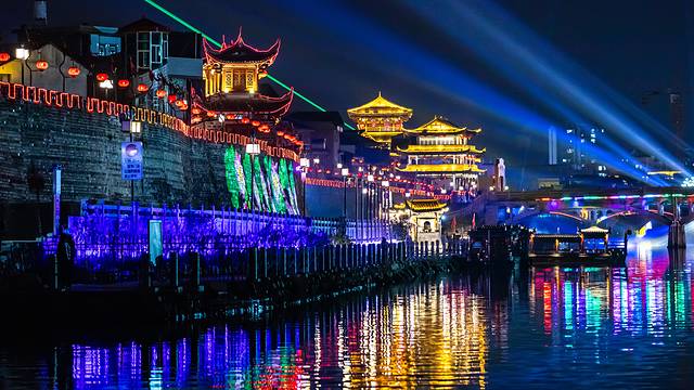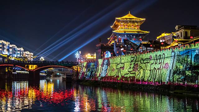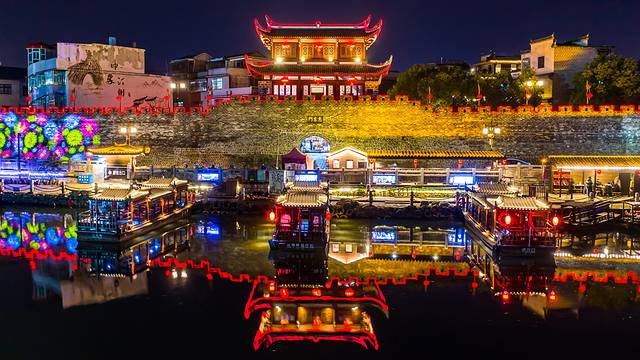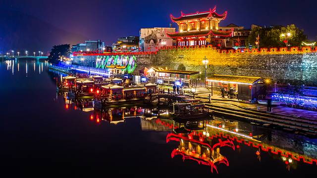 我们于晚上抵达,就是冲着眼前这夺目震撼的灯光秀而来,汀江两岸,金碧辉煌,城墙描红,光柱冲天,乘坐游船来个汀江夜游是必须的,我们进入状态也快,一上来就看到了汀州古城最美的样子。