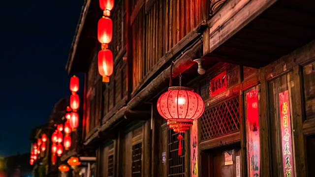 漫步汀州古城的老街,不知道是因为临近了新春还是原本就是这样的设计,街头巷尾,挂满了吉祥红火的灯笼,蓝色的天空,深褐色的旧门板,大红的灯笼,崭新的春联,一下子就带足了气氛感。