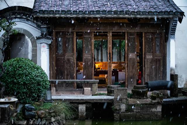 步出前台区域就是片小庭院,在这里逛逛能发现不少乐趣。首先映入眼帘的是网红泳池,青绿色的纱幔和透明船虽然在周遭的徽派建筑前让人有些出戏,但不可否认深受网红们喜欢。我入住的两天气温几乎只有零度,可还有小姐姐穿着泳衣在这里拍照。