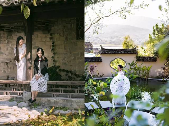 酒店内部更像是一个精巧的徽派园林,甚至比我逛过的不少园林类景点更容易出片。蜿蜒的小桥流水,错落有致的亭台回廊,曲折回转处都会有不少网红打卡点。一般平时诗莉莉给的三店通兑套餐,蔚颜府会包含旅拍6张成片,强烈建议大家春夏来,绿意葱茏,轻松可以有好看的照片。