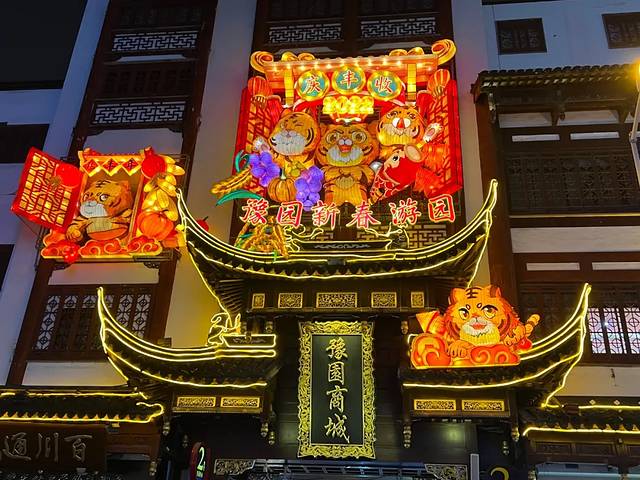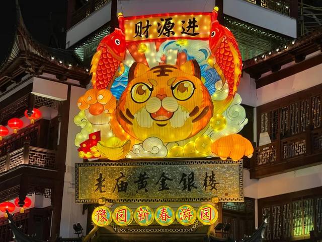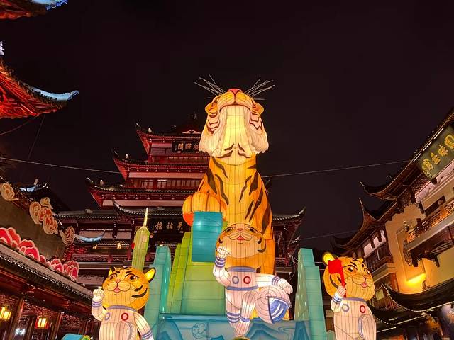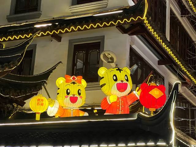 整个豫园的物理空间并不大,和最近红遍pyq的自贡灯会不同,豫园灯会的灯组不多,更加偏重于展示及弘扬传统民俗文化。上海地区的元宵灯会最早可以追溯到汉代,吴王刘濞将扬州灯会引入松江。明代以后,今上海地区的元宵灯会已十分普遍,其中最热闹、最精彩的场所就在松江府上海县城的城隍庙、豫园一带。每年的生肖是豫园灯会的一大主题,虎年将至,今年的主角自然是虎虎生威的生肖虎。造型各异的大小老虎转场在各个广场和屋檐间,留下它们的身影,如屋檐上的巧虎、老庙黄金街口招财虎。