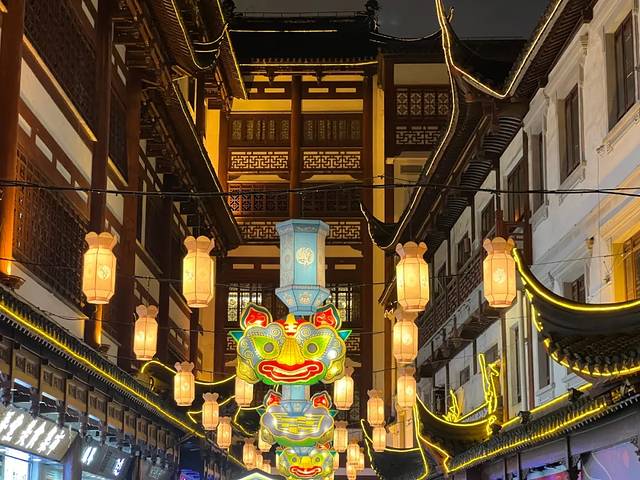 虽然豫园不大,逛逛1小时足矣,但整片区域的仿古建筑其实也是个观灯的亮点,这些建筑的灯光经过了非常细致的设计。穿梭其中,还能看到不少传统走马灯、年画花灯,还有泡泡玛特联名款呢。