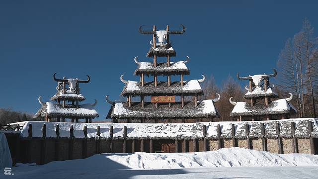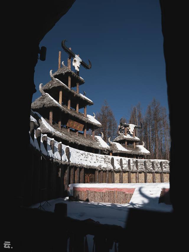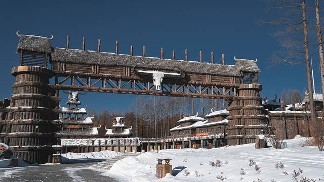 讷殷部是建州女真八大部落之一,因祖居讷殷江而得名。正门口的牛头门在雪地里散发着神圣的光芒。
