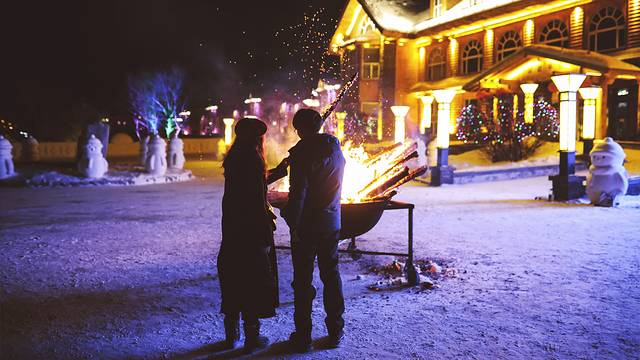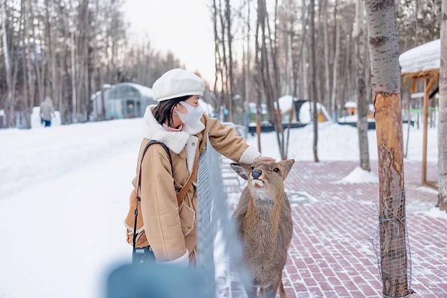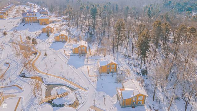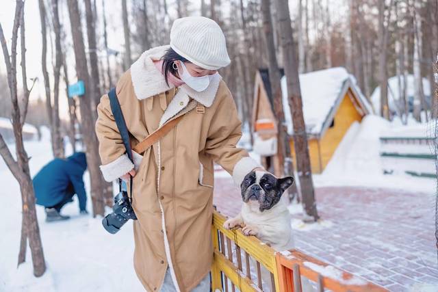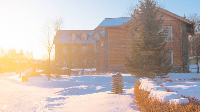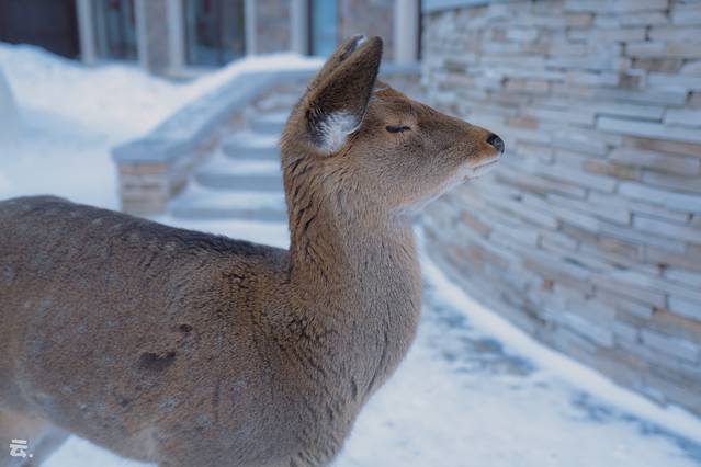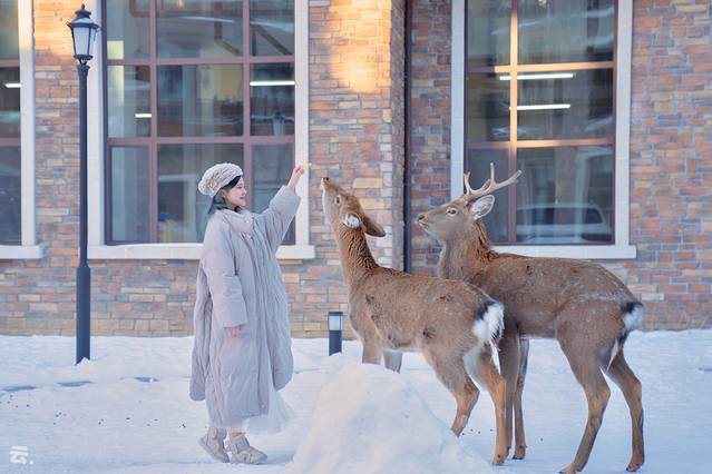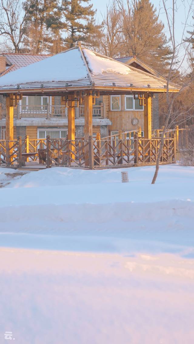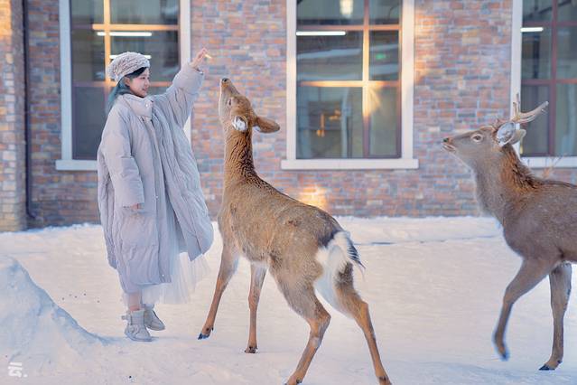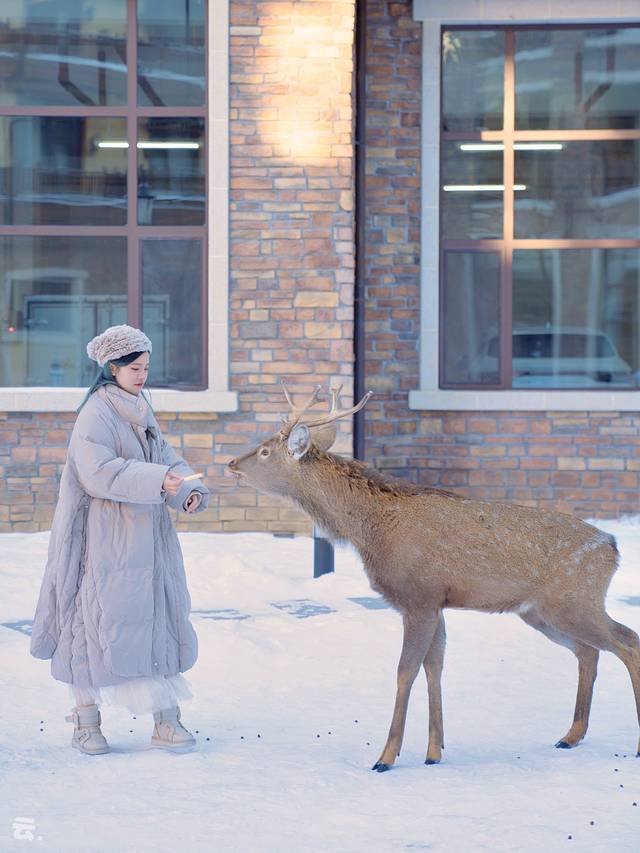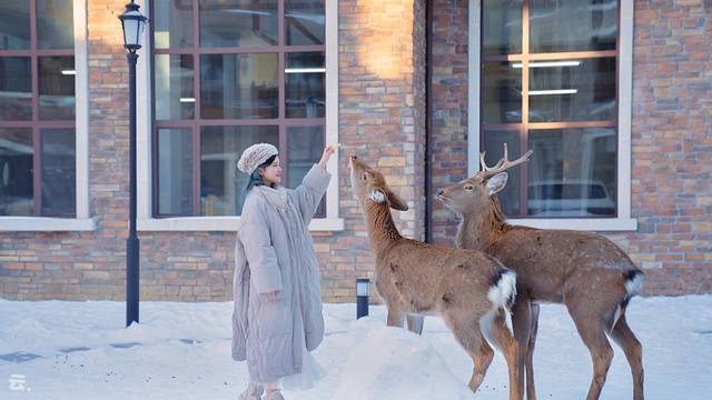这家酒店最近可太有名了,覆着白雪的三角木屋连成排,远看真的有点像冬季瑞士山间的小镇采尔马特。但最让他出圈的应该是院子里养的两头小鹿,入乡随俗,应该叫它们“傻狍子”哈哈哈。