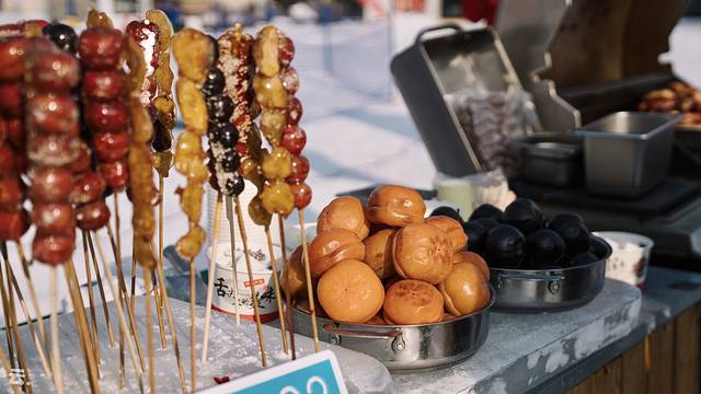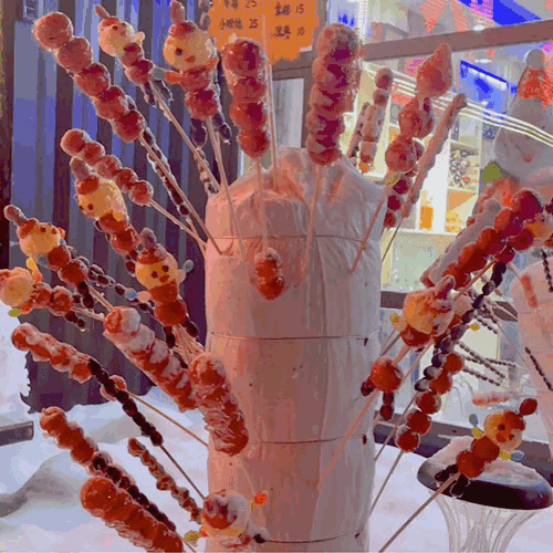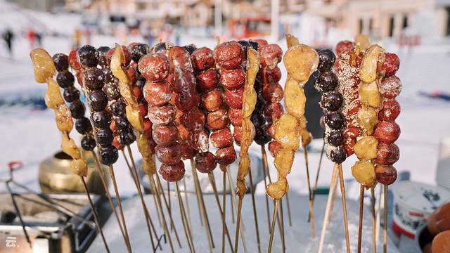 餐厅门口还放着冻梨、冻柿子和冰糖葫芦,冻得邦邦硬,冻梨和冻柿子吃之前要在水里泡半小时解冻,但冻冰糖葫芦不需要,直接吃像水果冰沙,太好吃了!墙裂推荐草莓和葡萄的!