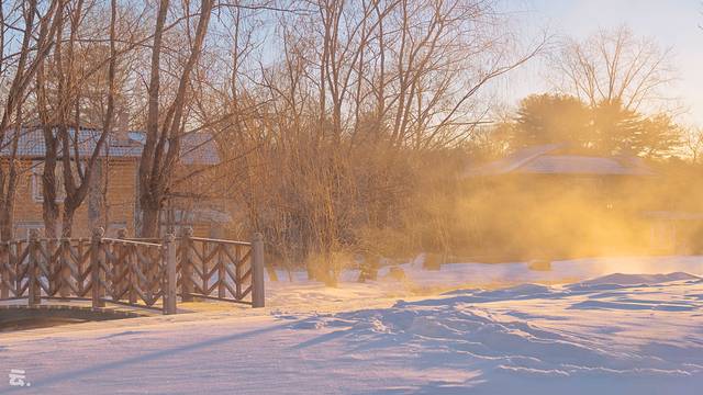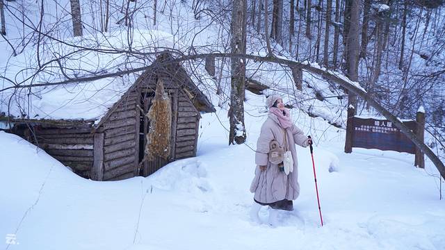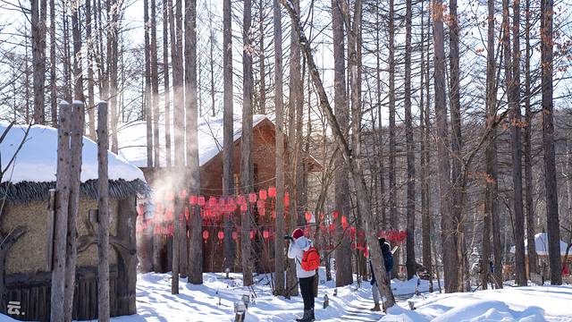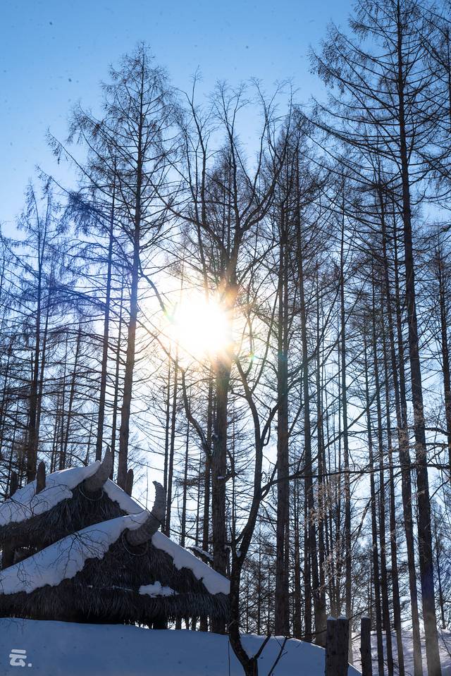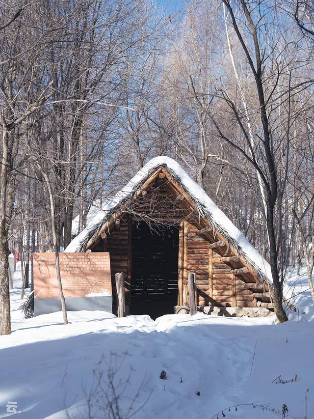 穿过祭祖殿,是大雪覆盖的原始森林,里面安安静静地展示着修复完成的满族木屋村落,每一间都各有千秋。