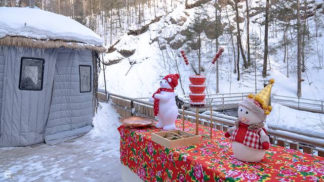 我们在树林里朝深处走,有个搭好的撮罗子可以休息,帐篷里还放着热茶和冻梨、冻柿子。