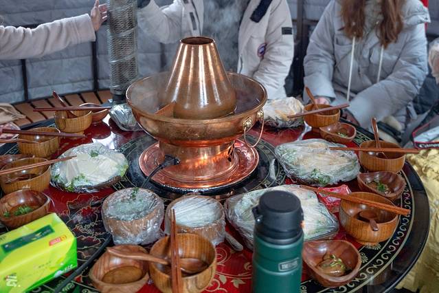 东北不只有铁锅炖、锅包肉,今天中午领队带我们来冰水泉旁的帐篷里吃冰水泉火锅。