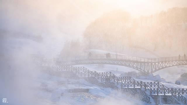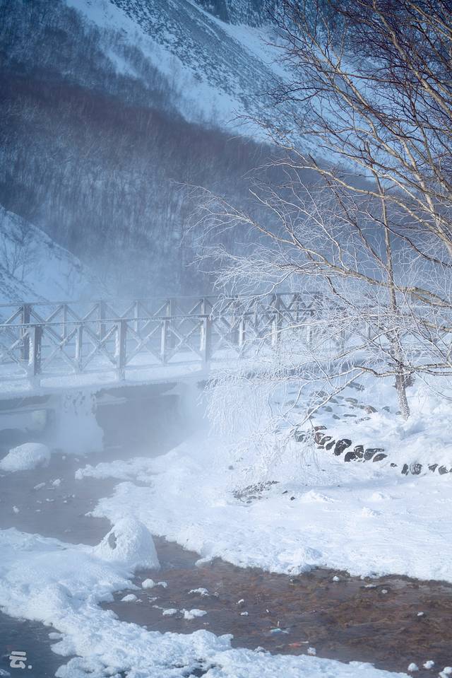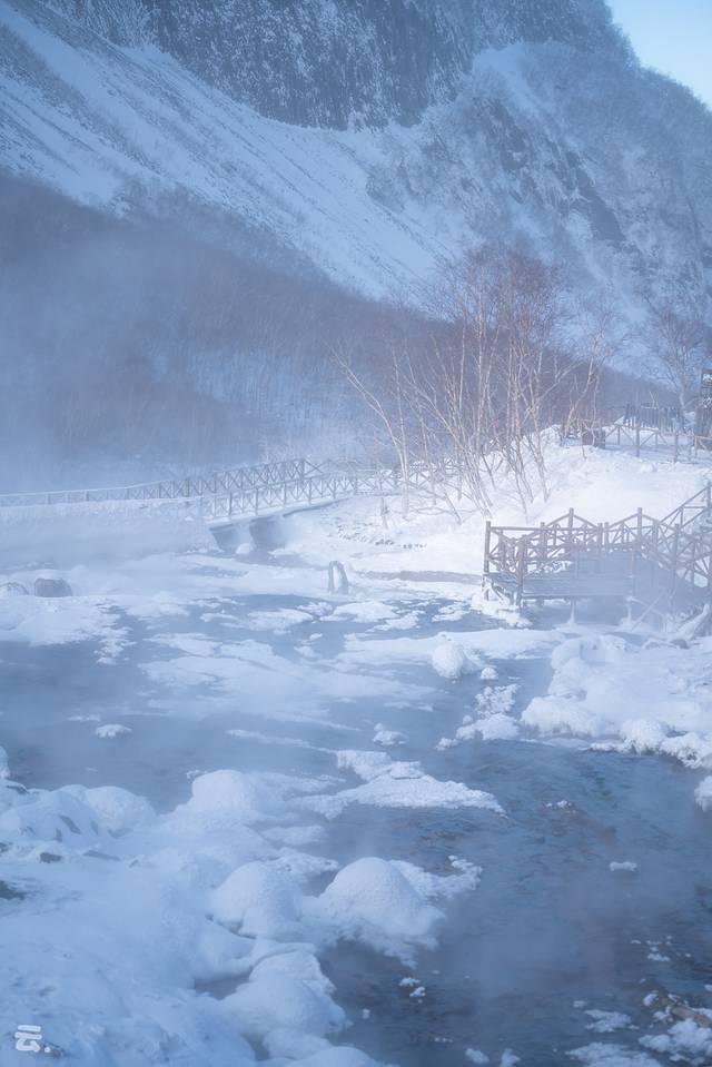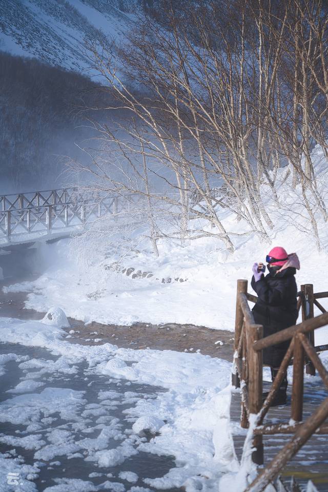 从这里开始沿路的风景就变得好美,雾气缭绕,无数个温泉争先冒出温泉水,噗噜噜的,最高竟有83度。蒸腾的热气凝成冰霜挂满树枝,像仙境一般,美轮美奂。
