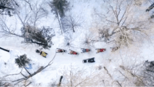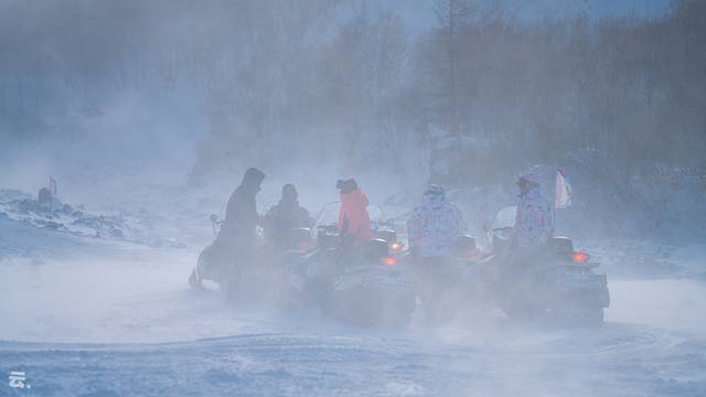 为了让我们有更好的参与感,海龙组织了一场团队雪地摩托比赛,所有人,无论男女老少,骑没骑过摩托都得参加,比赛场地是在雪场对面的树林深处一片空旷雪地上。