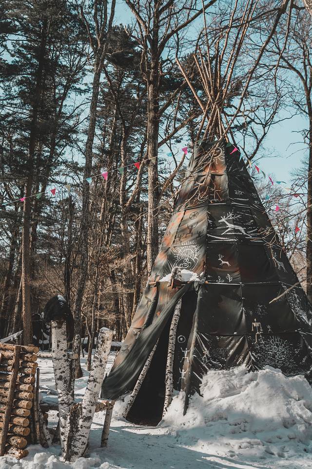 眼前这个圆锥形小帐篷叫“撮罗子”,是东北狩猎和游牧民族传统居所,不同于蒙古包。之前冬天在俄罗斯北部的驯鹿园也看到过类似的帐篷,不过是敞开式的,他们还会在中间生上炭火取暖。