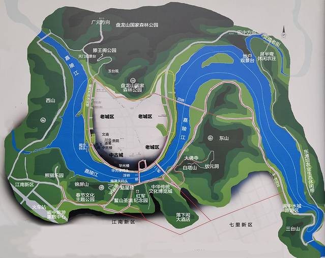 到阆中只有两个小时路程,路上很通畅,但是一进城,就到处是人群,车位很难找。我花了大约二十分钟才在张飞南路的一个加油站处,挤进一个空位。把车锁好,提上行李去网上携程预订的客栈。沿路有份地图牌子,我拍了下来,重新加工了一下。阆中是一个北面依靠盘龙山,其它三面环水的风水城市,我此前来过两次,专门做了游记介绍。今天我来不是到处看山玩水,而且想把自己沉浸在欢乐过节的古城人群中,好好体验一下已经久违了的那种过年的景象。